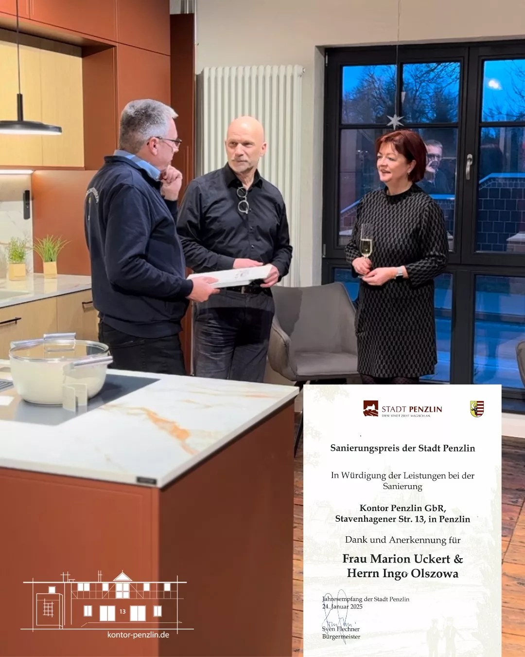 Wir sind stolz und freuen uns riesig, den Sanierungspreis der Stadt Penzlin gewonnen zu haben! Diese Auszeichnung wurde uns feierlich von Herrn Flechner, dem Bürgermeister von Penzlin, überreicht – gerade rechtzeitig zu unserem 3. Geburtstag!