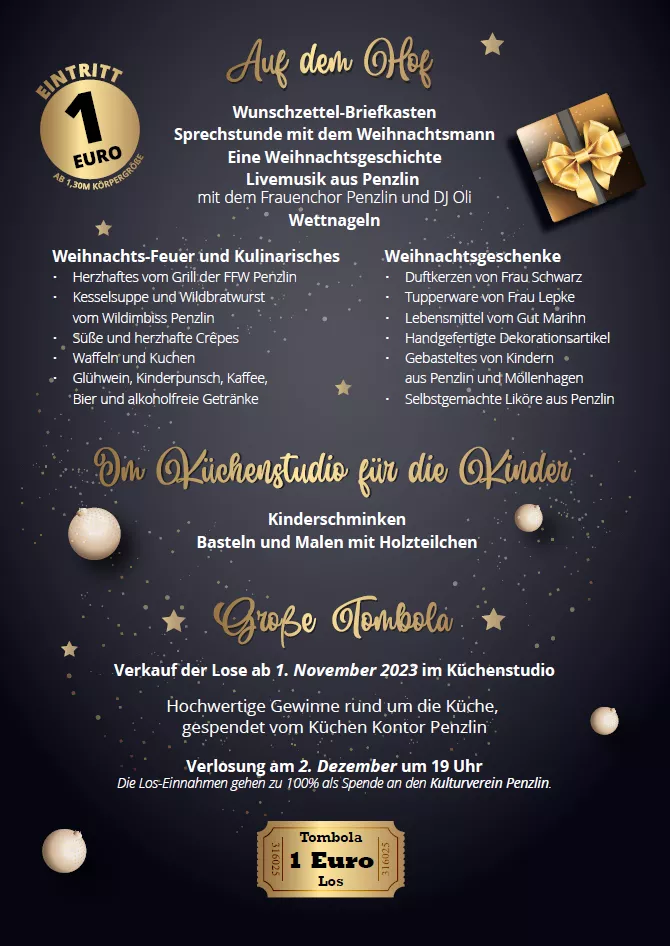 Am 02. Dezember 2023 ab 14 Uhr in der Stavenhagener Straße 13, 17217 Penzlin findet wieder unser beliebter Weihnachtsmarkt statt.